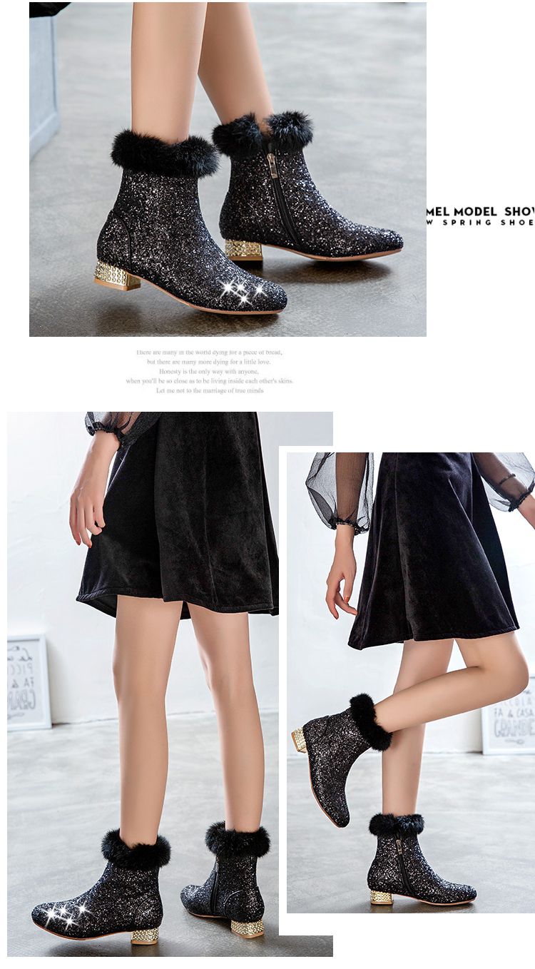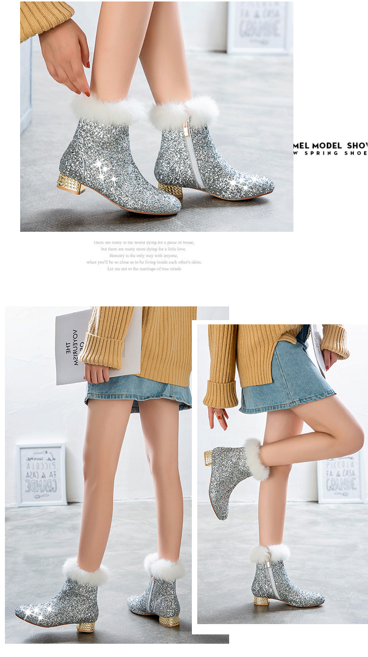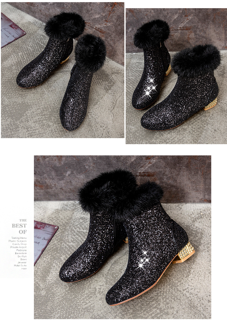 Fashion sequined low heeled rabbit fur short boots
