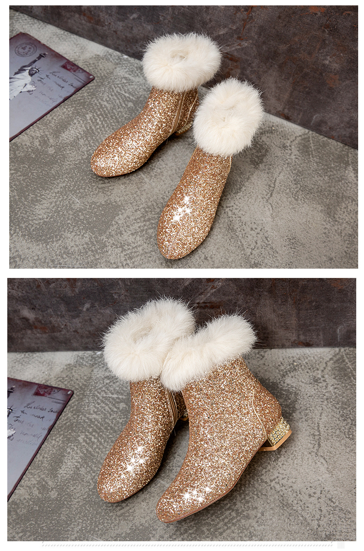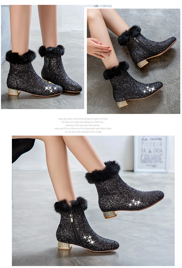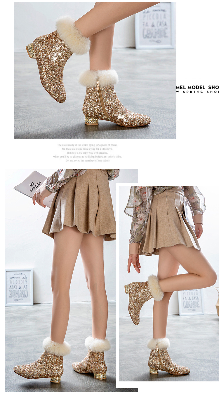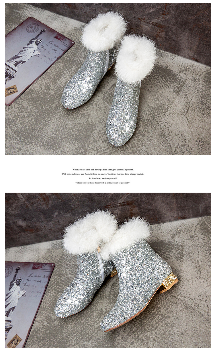 Fashion sequined low heeled rabbit fur short boots